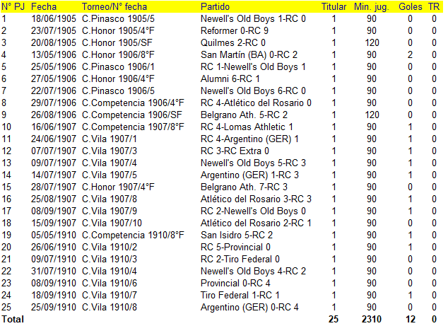 Debut oficial en Central: 18 de junio de 1905, vs. Newell's Old Boys 0-1 (V)