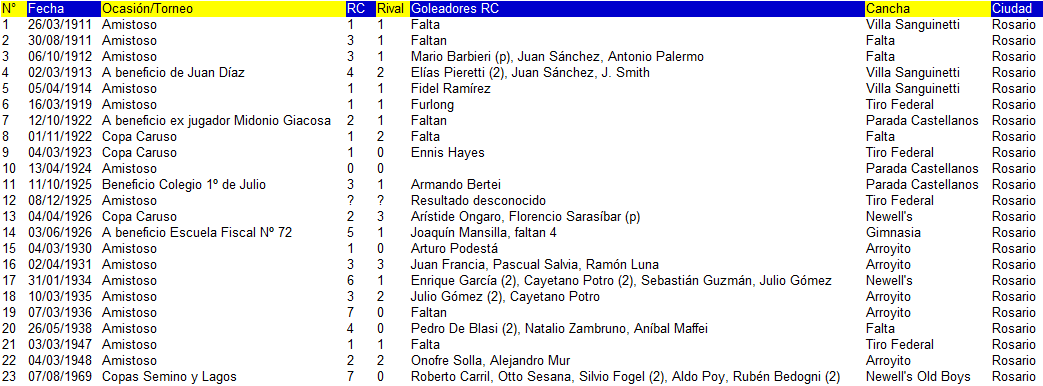 | 1 | 26/03/1911 | Amistoso | 1 | 1 | Falta | Villa Sanguinetti | Rosario |